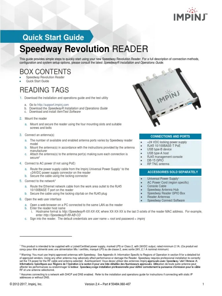 Autopilot capability simplifies deployment and . Authentication · impinj speedway rfid readers datasheet · impinj speedway quick start guide · impinj speedway installation and operation guide · impinj rshell . Speedway revolution getting started guide. Rf interference, tag quantity, ambient rf noise, and even building materials near an rfid installation all affect system performance. After extensive testing, we've determined that the impinj rfid readers are most suitable for race timing.